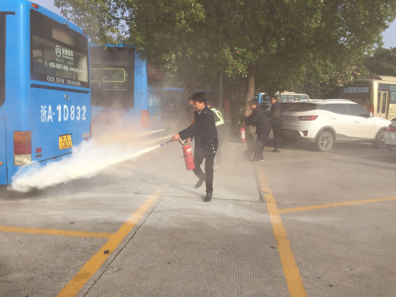 上午9時,演練正式開始,一枚煙幕彈在公交車底部燃燒,該公交車開始冒煙,9時25秒,一名保安在巡查時發現突發情況,立即使用4KG手提式干粉滅火器進行撲救,隨后進行上報并報警,9時30秒時,場站監控室發現 “火情”,拉響警報,9時1分10秒通惠路站一車隊、二車隊、五車隊及物業消防應急隊伍趕到現場,用4KG手提式干粉滅火器進行撲救,場站司機迅速疏散 “起火”公交車周邊車輛,9時1分45秒第一輛車被安全疏散,9時2分25秒義務消防隊員啟用消防栓,9時2分35秒消防水帶出水,9時3分45秒火勢撲滅,警報解除。