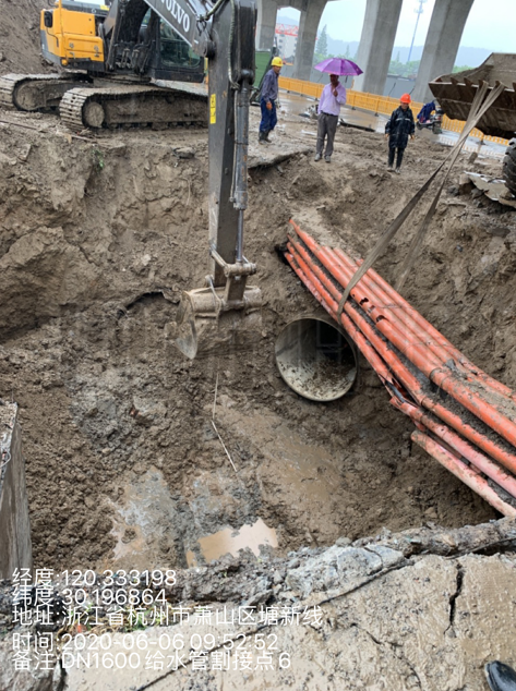 面對(duì)如此復(fù)雜困難的局面,如何在高架工程總體進(jìn)度按計(jì)劃有序推進(jìn)的前提下,又要保證管道能盡快完成遷改,擺在了建管公司征遷部工作人員的面前。建管員工充分發(fā)揚(yáng)“干”字當(dāng)頭,征遷部積極牽頭各相關(guān)部門和公司其它部門科室,通過(guò)不斷地現(xiàn)場(chǎng)踏看和實(shí)地摸底排查、對(duì)各方的施工時(shí)序予以協(xié)調(diào)、組織相關(guān)的管線產(chǎn)權(quán)單位到現(xiàn)場(chǎng)進(jìn)行交底,密切聯(lián)系沿線鎮(zhèn)街協(xié)調(diào)前期政策處理,根據(jù)現(xiàn)場(chǎng)實(shí)際確定了最佳管道遷改路徑。解決了路面交通情況復(fù)雜、施工作業(yè)面受限,將各方的交叉施工對(duì)管道遷改推進(jìn)影響降低到最小。如這次割接的DN1600給水管位置均在現(xiàn)狀交改保通車道上,新舊管連接時(shí)必需組織交通導(dǎo)改。建管公司會(huì)同環(huán)境投資公司提早謀劃,緊密配合,積極主動(dòng)地與交警等相關(guān)職能部門對(duì)接,通過(guò)多次協(xié)調(diào)和評(píng)審,按時(shí)完成涉路交改相關(guān)行政審批。在與環(huán)境集團(tuán)一起進(jìn)行了充足的準(zhǔn)備工作之后,本次DN1600給水管割接戰(zhàn)正式拉開帷幕。暴雨一波接一波,天公的不作美給遷改工作帶來(lái)了更大的壓力,建管公司前期部相關(guān)人員會(huì)同供水公司、投資公司的相關(guān)領(lǐng)導(dǎo)現(xiàn)場(chǎng)協(xié)調(diào)、緊盯節(jié)點(diǎn),全力以赴打下了本次割接戰(zhàn)。
