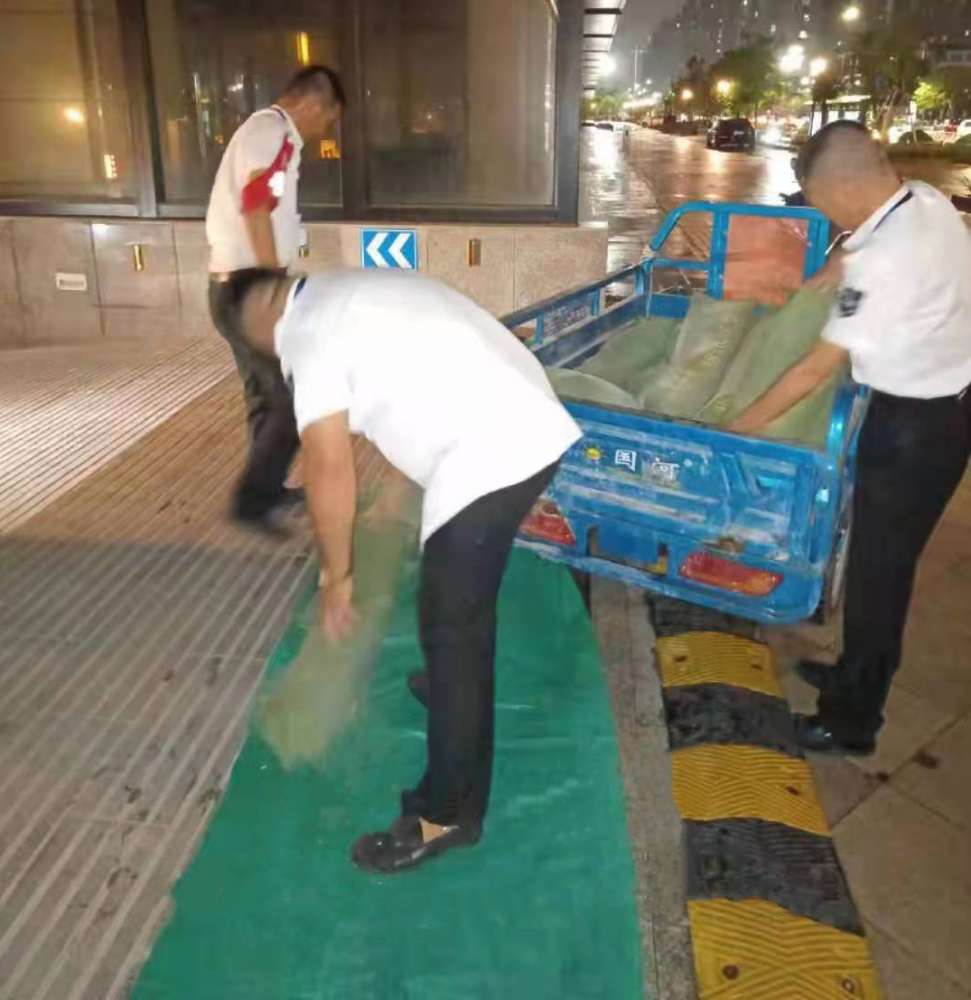 2.組織工作人員用防汛沙袋及時堵住出入口,做到最大程度地阻止雨水流向車庫,為業(yè)主財產(chǎn)保護提供了一道屏障。