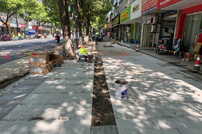 當前進度:蕭然南路、拱秀路、潘水路三條道路正在側平石及人行道板鋪設中,西河路處于行道樹補種更換階段。