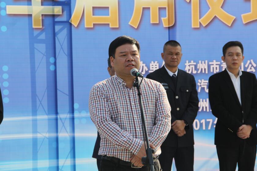 區(qū)政府辦公室副主任邵岳橋宣布首條準(zhǔn)快速公交開(kāi)通。